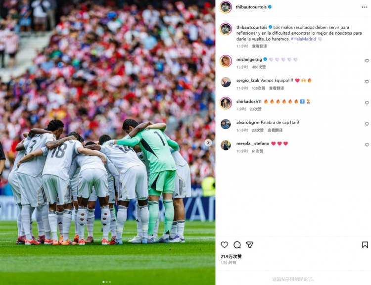 门将库尔图瓦也在社媒晒出合照鼓励球队,配文写道:“糟糕的结果应该成为反思自我的契机,面对困难局面我们应该找回最佳状态扭转局势。我们能够做到的。”